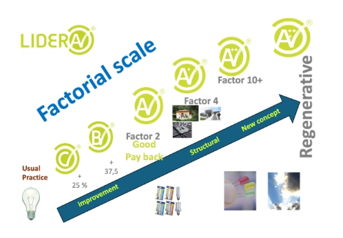 The system rates performance on a scale of 0 to 10, which is then converted into letters from G to A (up to A+++). Level 1 or E indicates current (or reference) practice, while level 2 or A typically denotes performance roughly 50% better than level E. Level A+ corresponds to a Factor 4 (75% improvement over level E), and A++ indicates a Factor 10 (90% improvement over level E). In rare instances, an A+++ level may be assigned, signifying a regenerative state.