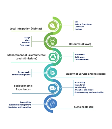 The twenty (20) areas and forty (40) programmatic criteria are assigned weights that support the calculation of the overall performance level on the same scale of 0 to 10, covering local integration, resources, loads, quality of service, resilience, socioeconomic experiences, and sustainable use.